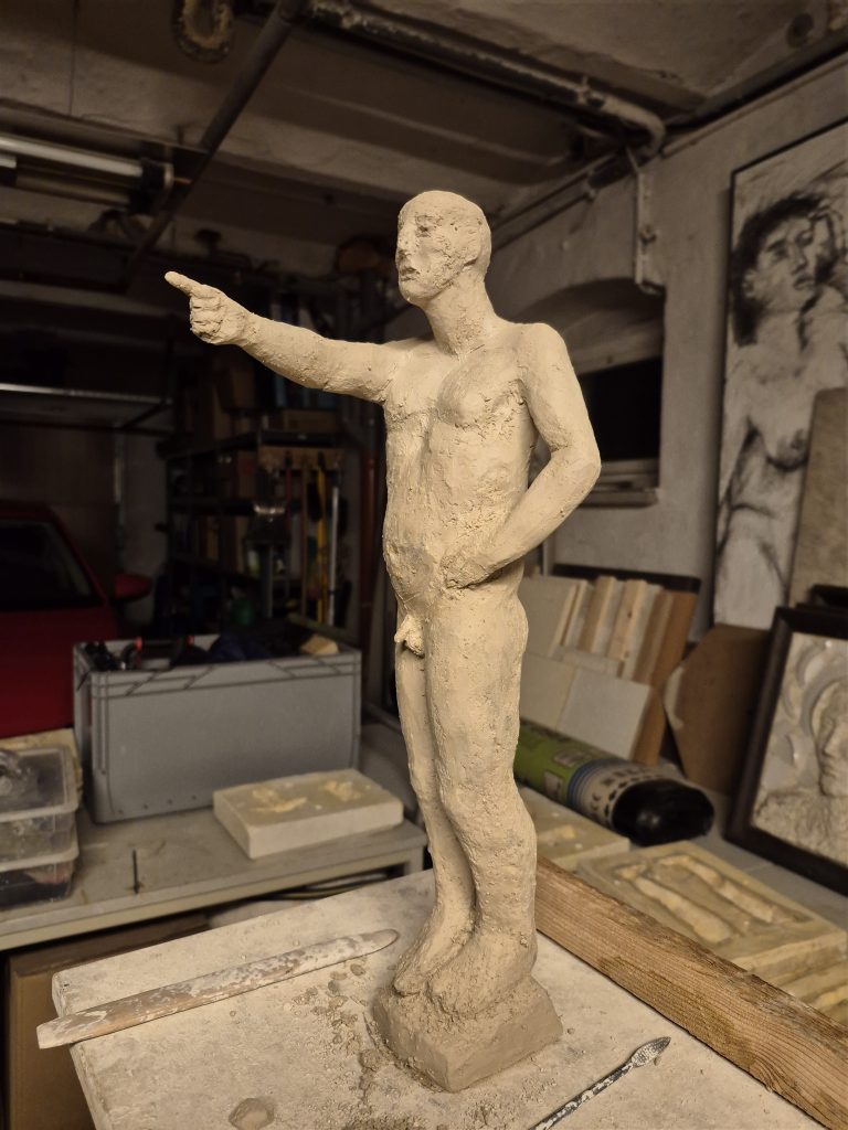 „Der Zeiger“ – der Titel dieser Figur steht schon fest. Hier wird er noch modelliert. Später montiere ich ihn auf ein Kamerastativ, auf dem er beweglich die Richtung weisen kann.