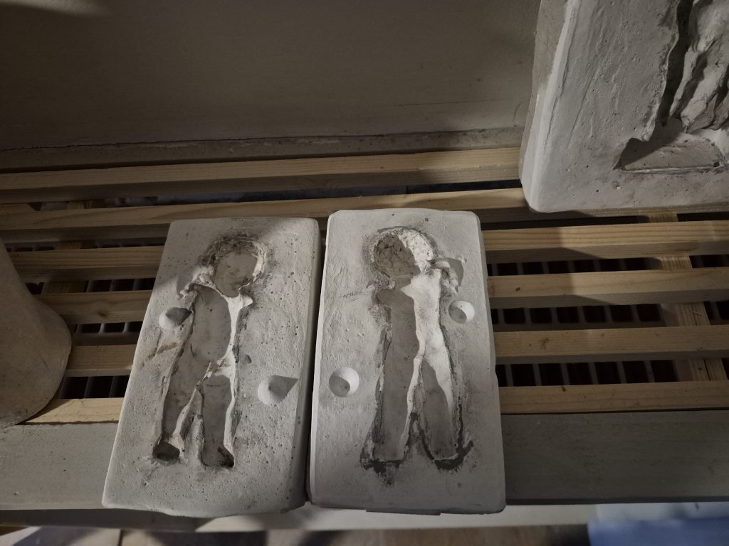 Das Motiv des Jesusknaben, der die Welt wie einen Ball zum Spielen in der einen Hand hält und beinahe verlegen die andere Hand zum segnenden Gruß hebt, habe ich als mittelalterliche Schnitzerei gesehen. Diese Geste hat mir so gefallen, dass ich sie in der kleinen Keramikfigur nachempfunden habe. Hier sieht man die Form und die kleinen Figuren bei der Nachbearbeitung. Was folgt ist der Schrühbrand und Glasurbrand.
